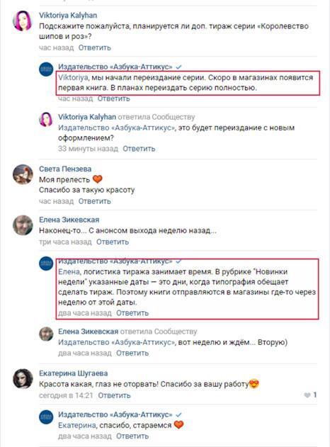 Вот пример из сообщества издательства «Азбука-Аттикус» в ВК. За выходом новых изданий следят все книголюбы. Комьюнити-менеджер дает точную информацию о планах, возможности приобретения книг и тушит пожары негатива, возникшие из-за задержек