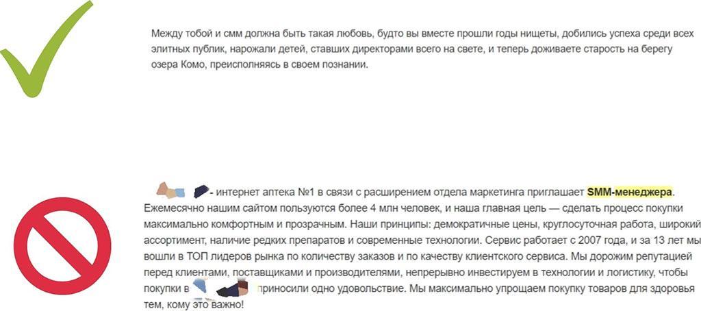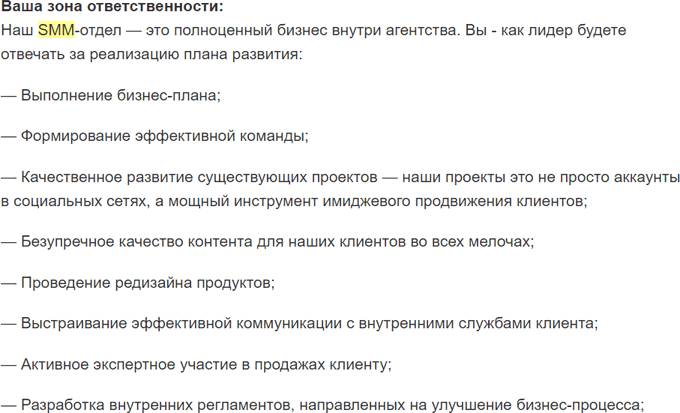 Перебор с описанием. Иногда в вакансиях у HR (или людей, которые размещают вакансию) появляется сильное желание рассказать о своей компании. Конечно, важно сообщить, что вы занимаете лидирующее положение на рынке, но лучше ограничиться при этом парой строк, а не полотном текста. А еще лучше – рассказать про отношение к SMM в компании, как это сделали в удачном примере ниже.