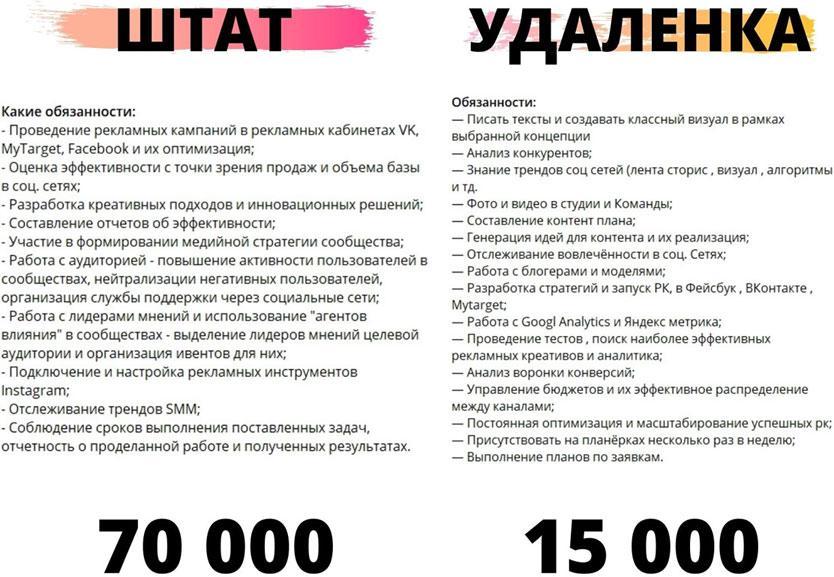 Зарплата. Наша редакция весной 2022 года провела исследование зарплат SMM-щиков. Данные, собранные по всей России, показали, что гонорар за работу в месяц начинается от 15 тысяч и доходит до 300 тысяч рублей. Работодателю нужно исходить из своих потребностей: нанимать специалиста в штат или удаленно. Сотрудник в штате или на удаленке может никак не отличаться по компетенциям или вовлеченности от штатного. Тут скорее вопрос в потребностях бизнеса: новичков часто берут в штат, чтобы обучить основам, а потом перейти к практике под чутким контролем наставника. Специалистам же такой надзор не нужен – они часто работают удаленно. В любом случае, если размещать вакансию в интернете, то важно сохранять конкурентную цену по всей сфере. Новичок за 5 тысяч рублей в месяц вряд ли сможет тянуть несколько соцсетей крупного бизнеса. И не важно, будет он в штате или на удаленке.