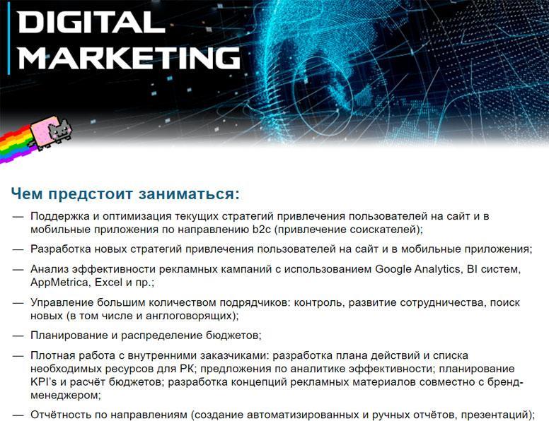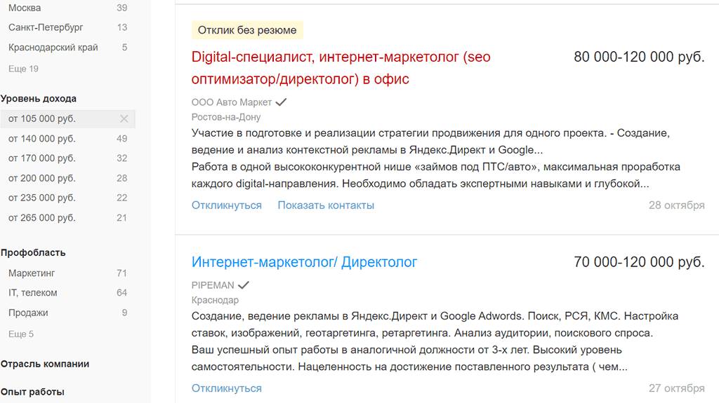 Вакансии для интернет-маркетологов с опытом от 1 до 3 лет вне столичного региона