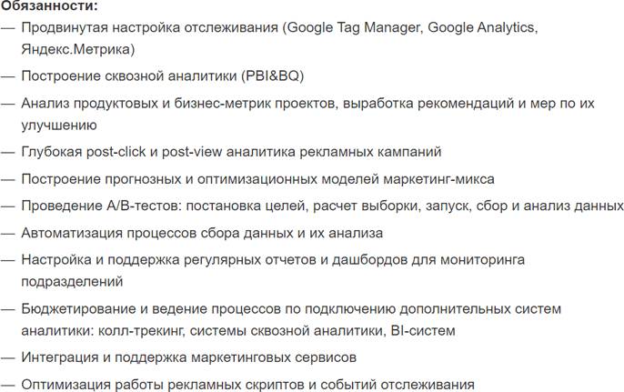Пример обязанностей веб-аналитика из реальной вакансии на hh.ru