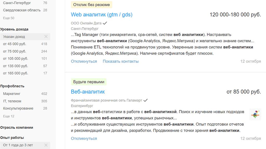 Примеры вакансий для веб-аналитиков с опытом 1–3 года