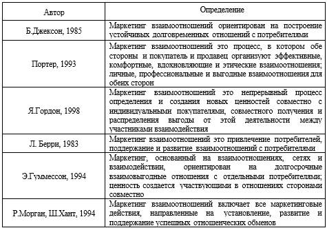 Рассматривая более широко определение маркетинга взаимоотношений, следует выписать термин «Total Relationship Marketing», предложенный Э. Гуммессоном: «маркетинг, основанный на взаимоотношениях, сетях и взаимодействии, ориентирован на долгосрочные взаимовыгодные отношения с отдельными потребителями; ценность создается участвующими в отношениях сторонами совместно».