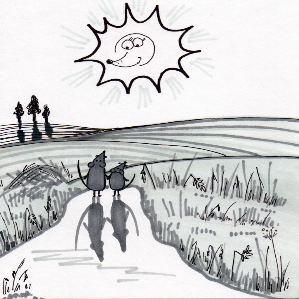 Макс вышел на улицу. Микс не отставал. Макс осмотрелся вокруг и почесал между ушами. Микс тоже остановился и тоже почесал между ушами. А так как рассвет уже решил поднять солнце, то две длинные тени тоже чесали между ушами. Макс уверенно пошел в сторону поля. Его передние и задние лапы шагали вместе, как у солдата. Микс тоже шагал твердо и ритмично в такт с Максом. Мордочка сама собой сделалась серьезное. Он не знал куда идет, но был уверен, что куда надо.