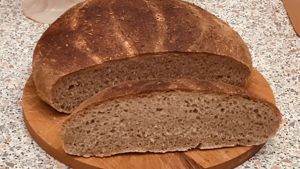 Замешивание при помощи миксера: В чашу миксера наливаем воду комнатной температуры, добавляем всю ржаную закваску (опару). Выкладываем муку. Добавляем розмарин и соль. Вымешиваем тесто в течение нескольких минут на низкой скорости, а затем, ещё в течение нескольких минут, на средней скорости. При необходимости корректируем гидратацию, чтобы получить умеренно развитую клейковину в тесте. Тесто получается довольно мягким.