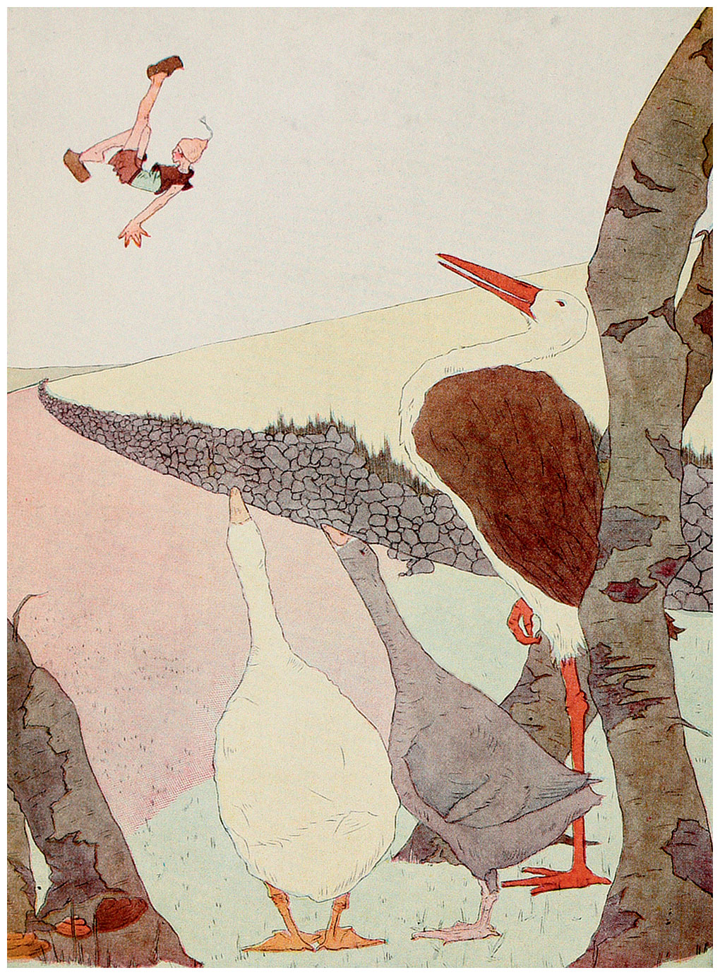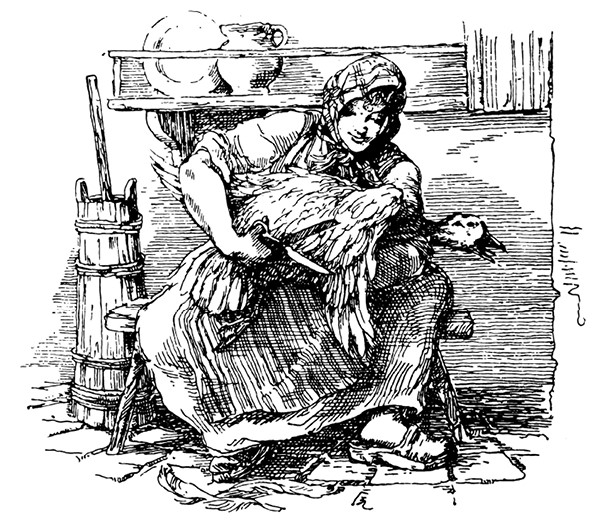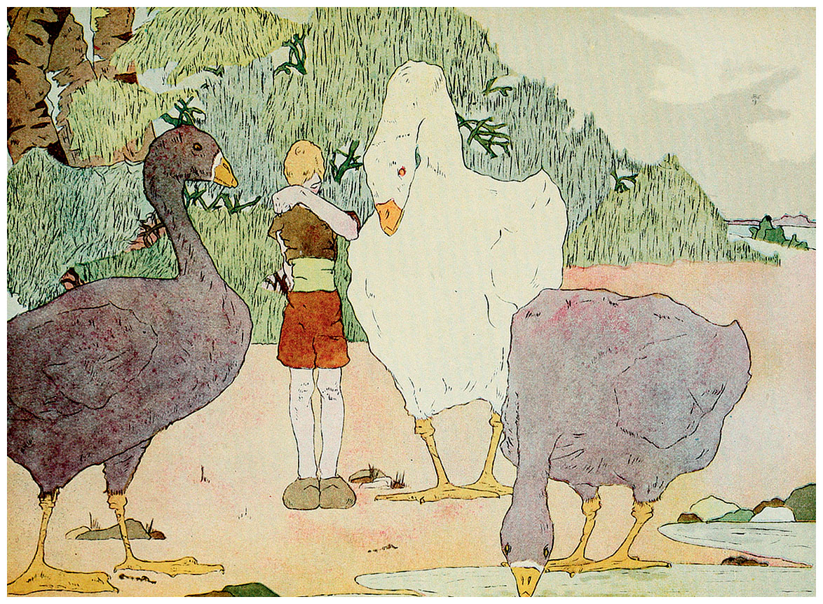 Счастье ещё, что женщина не успела подрезать ему крылья. Только два пера упало из-под её ножниц, когда дверь вдруг отворилась и на пороге появился какой-то чудной малыш. Такого женщине в жизни видеть не доводилось, и она вообразила, будто это сам Гуа-Ниссе, домовой. Выронив в страхе ножницы, она всплеснула руками и выпустила гусака.