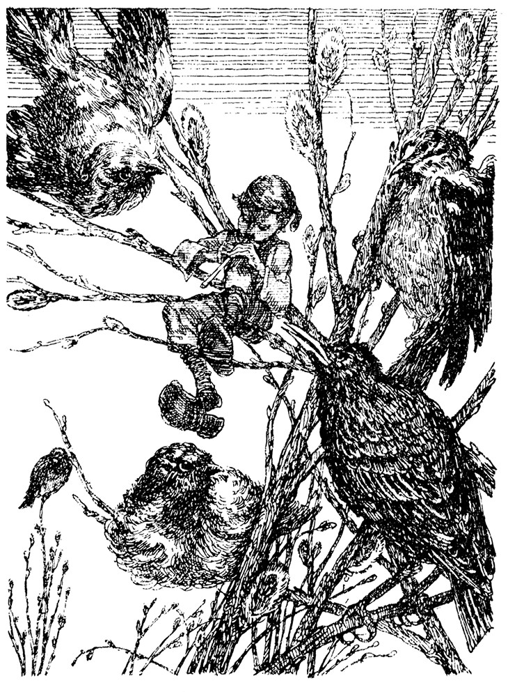 Снова настало воскресенье. Прошла уже целая неделя с того дня, когда мальчика заколдовали. Он по-прежнему был мал, но теперь, похоже, это не очень его огорчало. В воскресенье после полудня он сидел, примостившись на ветке высокой раскидистой ивы на берегу озера, и играл на тростниковой дудочке. Вокруг теснилось множество синиц, зябликов и скворцов – сколько могло поместиться на дереве. Птицы громко распевали, а Нильс пытался подражать им на своей дудочке. Но он был так неискусен и так фальшивил, что у его маленьких наставников все пёрышки вставали дыбом. Бедные пташки жалобно вскрикивали и в отчаянии всплёскивали крылышками. Слушать, как они изо всех сил стараются научить его, было так забавно, что Нильс засмеялся и выронил дудочку.