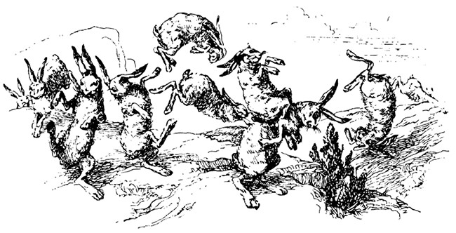 Ожидания их были не напрасны: не успели улететь вороны, как на пустошь хлынула лавина зайцев. Не заботясь о порядке, они мчались и поодиночке, и по трое-четверо в ряд. Затем, встав на задние лапки, зайцы с такой неудержимой быстротой ринулись вперёд, что только их длинные уши замотались по сторонам. Они крутились на бегу, высоко подпрыгивая и барабаня себя передними лапками по бокам. Одни кувыркались, другие катились колесом, третьи вертелись волчком, четвёртые скакали на передних лапках. Плясали они не в лад, зато своей живостью и весельем приободрили всех зверей, напомнили им, что зима позади, что вслед за весной, приносящей радость и веселье, шествует лето и скоро-скоро жизнь превратится в сплошной праздник.