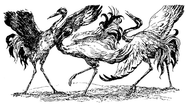 И вот со скалистого пригорка заскользили на пустошь серые, точно окутанные сумеречной дымкой, огромные длинноногие птицы со стройными шеями и маленькими головками, увенчанными хохолками из красных перьев. В каком-то таинственном забытьи соскальзывали они вниз и кружились, не то паря в воздухе, не то легко касаясь земли. Затейливо приподняв крылья, птицы исполняли какой-то сказочно прекрасный, невиданный танец. Казалось, будто серые тени затеяли игру, за которой едва ли в состоянии уследить взор. Не у туманов ли, витающих над уединёнными болотами, обучились птицы этому танцу?