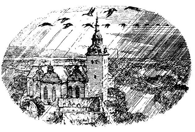 Над равниной в сторону горы тянется ещё одна тучка. Она останавливается над каждой усадьбой, над лачугами статаров и замками, над торговыми городками и селениями, над крестьянскими дворами и железнодорожными станциями, над рыбачьими посёлками и сахарными заводами. И всякий раз всасывает с земли небольшой, взлетающий вихрем ввысь столб крошечных серых пылинок, и от этого всё растёт и растёт, превращаясь в огромную тучищу, которая устремляется к горе Куллаберг. Тень от неё покрывает землю от прихода Хёганес до Мёлле. Застыв над местом игрищ, туча затмевает солнце. Серые воробьи дождём падают на один из скалистых пригорков, и проходит немало времени, прежде чем те, кто летел в самой серёдке, снова видят ослепительный свет солнца.