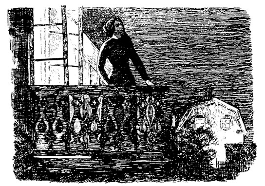 В это мгновение балконная дверь дома, мимо которого он проходил, распахнулась, и жёлтый свет заструился сквозь тонкие лёгкие занавески. Красивая молодая женщина вышла на балкон и оперлась на перила.