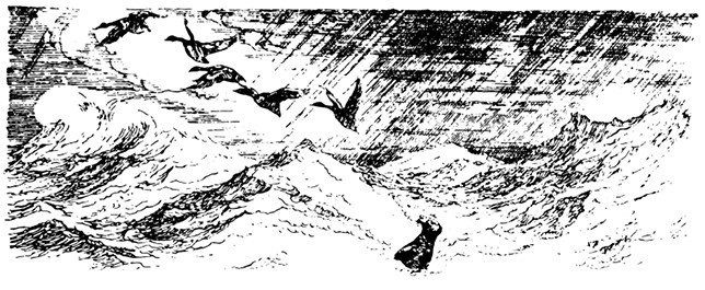 Разыгралась ужасная буря. Напрасно дикие гуси пытались повернуть назад, это было им не под силу. Ветер уносил их всё дальше и дальше в Балтийское море. Остров Эланд остался где-то позади, внизу простиралось лишь пустынное и безбрежное море. Оставалось только лететь и лететь по воле ветра.