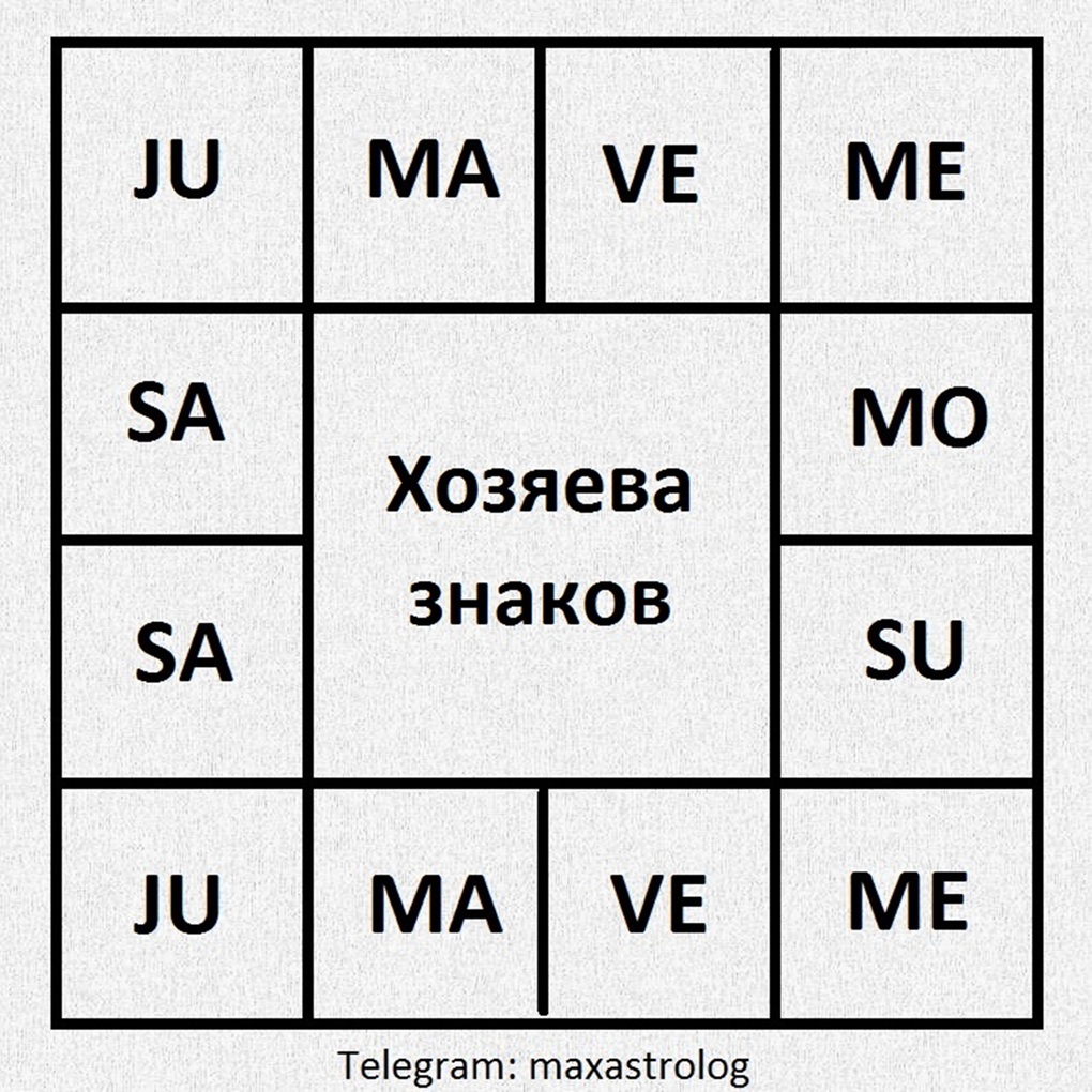 Перед вами изображение: в каждом квадрате, который соответствует конкретному знаку зодиака, вписаны обозначения планет управителей знака: Солнце управляет Львом или обитель Солнца – Лев, Луна управляет Раком или обитель Луны – Рак, Меркурий управляет Близнецами и Девой или обитель Меркурия – Близнецы и Дева и т.д., при этом Меркурий самая близкая к Солнцу планета, а Близнецы и Дева – это две точки на орбите его вращения, они в зодиаке ближе других знаков расположены к обители Солнца – Льву; в Близнецах Меркурий проявляет свою мужскую природу, а в Деве женскую; следом идёт Венера по такому же принципу: в Тельце она проявляет свою женскую природу, а в Весах мужскую; затем идёт Марс с Овном и Скорпионом; за ним Юпитер со Стрельцом и Рыбами; и, наконец, дальше всех находится Сатурн с Козерогом и Водолеем.