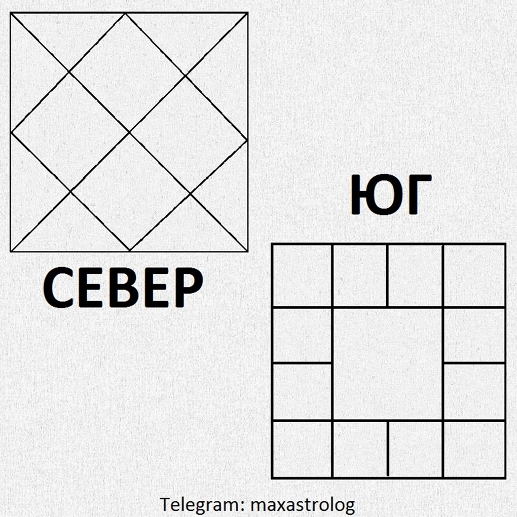 Итак, по сути, существуют две школы ведической астрологии: северная и южная, разница чисто техническая, в стилях изображения натальной карты, слева северный стиль, а справа южный.