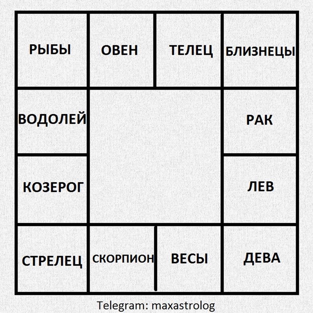 Первая клетка соответствует Овну, вторая по часовой стрелке Тельцу, третья Близнецам, и т.д., Раку, Льву, Деве, Весам, Скорпиону, Стрельцу, Козерогу, Водолею, и Рыбам; таков порядок расположения знаков зодиака, его необходимо запомнить.