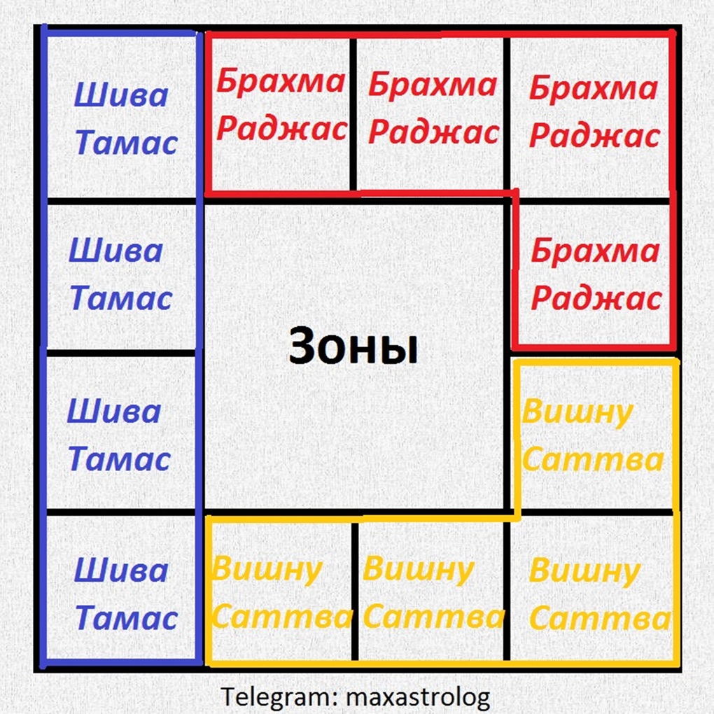 За полом следуют, так называемые, зоны: каждая зона включает в себя 4 знака: зона Брахмы или раджаса от Овна до Рака, зона Вишну или саттвы от Льва до Скорпиона и зона Шивы или тамаса от Стрельца до Рыб.