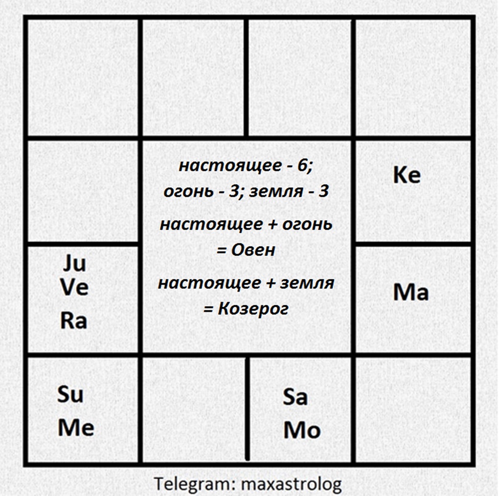 при таком раскладе планет, мы получаем сочетание креста настоящего: стихии огня и земли, значит, в синтезе получаем Овна и Козерога, при этом в самом знаке Овна вообще нет планет.