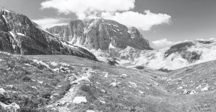 Летний альпийский пейзаж. Пешеходная тропа к озеру Драколимни в горах Пинд, Загори, Греция