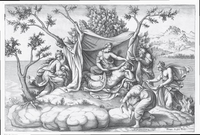 Рождение Аполлона и Артемиды на острове Делос. Гравюра Дианы Скултори (Мантуаны) по рисунку Джулио Романо, вторая пол. XVI в.