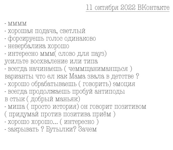 «…вчера было классное шоу стендап-импровизации. Причем не было разогрева, даже особо музыки перед выступлением, так как не было звукача и ноутбука, чтобы включить музыку. Была восхитительная динамика, и я ловил себя на мысли, что не умолкаю ни на секунду. Может, в этом и есть отчасти секрет хорошего шоу? А еще я заметил, что публика попалась прям моя. И неважно, что донатов было всего 400 руб. Сейчас я делаю шоу не ради денег, а ради опыта и тренировок. Мне почему-то стало лень монтировать выступления и выкладывать на YouTube-канал. Это не есть хорошо! Но как будто бы я прихожу к мысли, что некоторые шутки стали вплетены в шоу как бы с долгоиграющим заходом, а не короткие, как было раньше. И поэтому трудно вырезать или вырвать из контекста…»