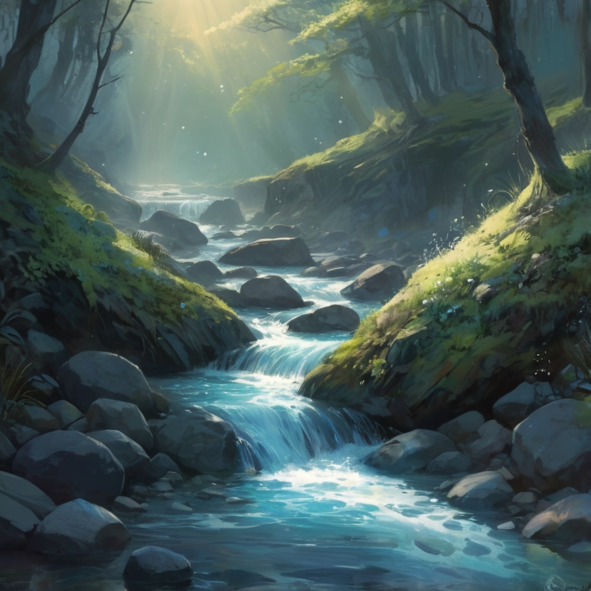 Внезапно до его ушей донесся тихий журчание воды – звук одновременно меланхоличный и красивый. Он оказался на берегу ручья, вода которого была прозрачна, как кристалл, и текла по гальке, мерцающей, как драгоценные камни. Это был Призрачный Поток, который, как известно, появляется только для тех, кто действительно ищет.