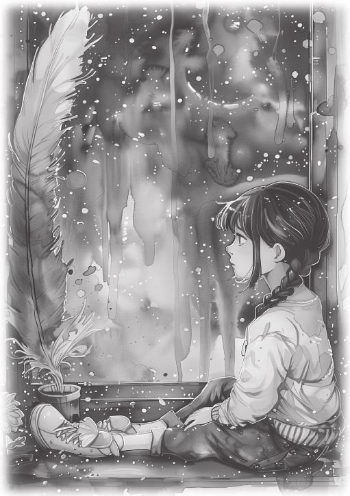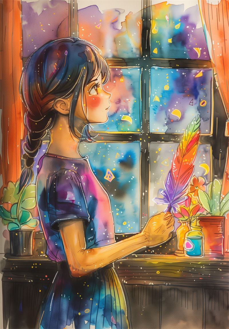 Она приоткрыла окно, и тут на подоконник лёгким ветерком занесло небольшое разноцветное перо. Когда девочка взяла в руки пёрышко, оно засветилось разными цветами – красным, оранжевым, жёлтым, зелёным, синим, голубым и тёмно-фиолетовым. Словно это был яркий калейдоскоп красок.