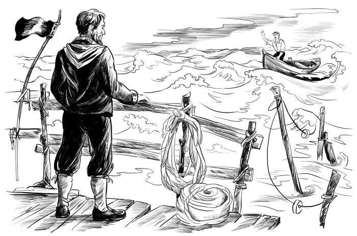 В один из таких дней двенадцатилетний сын Меннерса, Хин, заметив, что отцовская лодка бьётся под мостками о сваи, ломая борта, пошёл и сказал об этом отцу. Шторм начался недавно; Меннерс забыл вывести лодку на песок. Он немедленно отправился к воде, где увидел на конце мола, спиной к нему стоявшего, куря, Лонгрена. На берегу, кроме их двух, никого более не было. Меннерс прошёл по мосткам до середины, спустился в бешено плещущую воду и отвязал шкот; стоя в лодке, он стал пробираться к берегу, хватаясь руками за сваи. Вёсла он не взял, и в тот момент, когда, пошатнувшись, упустил схватиться за очередную сваю, сильный удар ветра швырнул нос лодки от мостков в сторону океана. Теперь даже всей длиной тела Меннерс не мог бы достичь самой ближайшей сваи. Ветер и волны, раскачивая, несли лодку в гибельный простор. Сознав положение, Меннерс хотел броситься в воду, чтобы плыть к берегу, но решение его запоздало, так как лодка вертелась уже недалеко от конца мола, где значительная глубина воды и ярость валов обещали верную смерть. Меж Лонгреном и Меннерсом, увлекаемым в штормовую даль, было не больше десяти сажен ещё спасительного расстояния, так как на мостках под рукой у Лонгрена висел свёрток каната с вплетённым в один его конец грузом. Канат этот висел на случай причала в бурную погоду и бросался с мостков.