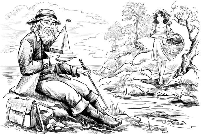 – Хорошо, – продолжал непонятную речь старик, не сводя глаз, в глубине которых поблёскивала усмешка дружелюбного расположения духа. – Мне, собственно, не надо было спрашивать твоё имя. Хорошо, что оно так странно, так однотонно, музыкально, как свист стрелы или шум морской раковины: что бы я стал делать, называйся ты одним из тех благозвучных, но нестерпимо привычных имен, которые чужды Прекрасной Неизвестности? Тем более я не желаю знать, кто ты, кто твои родители и как ты живёшь. К чему нарушать очарование? Я занимался, сидя на этом камне, сравнительным изучением финских и японских сюжетов… как вдруг ручей выплеснул эту яхту, а затем появилась ты… Такая, как есть. Я, милая, поэт в душе – хоть никогда не сочинял сам. Что у тебя в корзинке?