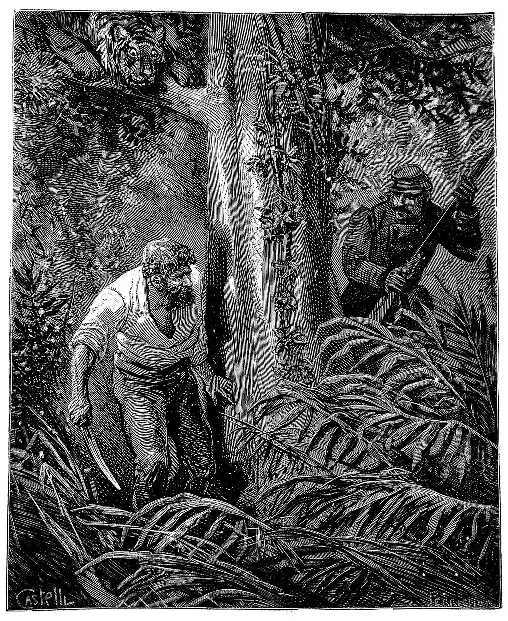В то же время ягуар был удивлен появлением Робена и, возможно, обескуражен его решительным видом. Так что он снова прыгнул, пролетел в трех метрах над головой человека и, вонзив когти в ствол дерева, под которым тот стоял, растянулся на ветке с глухим рычанием. Глаза его горели, усы встопорщились, морда оскалилась.