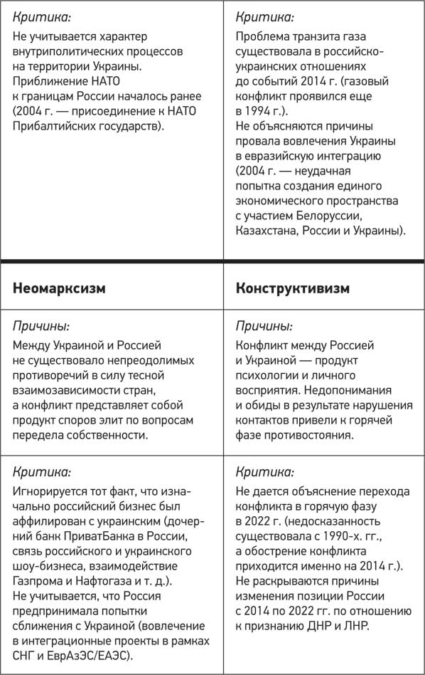 Ни одна из теорий международных отношений не дает исчерпывающего представления о причинах политических событий. В качестве примера рассмотрим сквозь призму ключевых теорий международных отношений (неореализма, неолиберализма, неомарксизма и конструктивизма) причины Специальной военной операции, начатой 24 февраля 2022 г. с целью денацификации и демилитаризации Украины.
