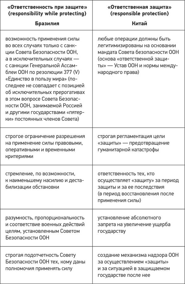 В июньском выпуске 2012 г. журнала «Китайские международные исследования» была опубликована статья, описывающая китайский подход, а именно концепцию «ответственная защита» (responsible protection).