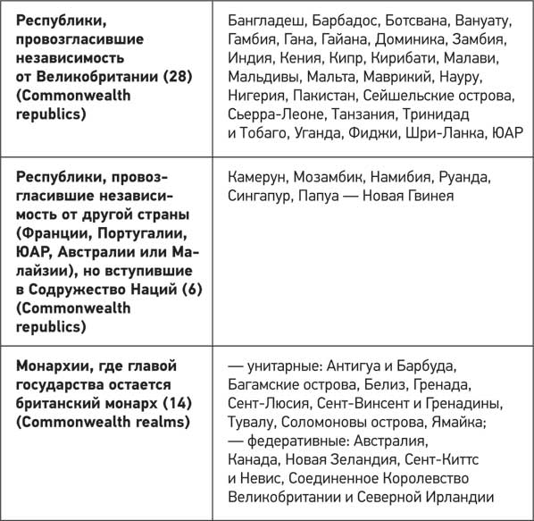 После обретения независимости Индией в 1947 г. Содружество наций стало главным инструментом политического взаимодействия Великобритании с суверенными государствами «английского мира». Государства-члены поддерживают дипломатические отношения между собой через институт Верховных комиссаров. Из бывших британских колоний в организацию не вошли Бирма (современная Мьянма) и Аден (Южный Йемен), а из протекторатов – Бахрейн, Египет, Израиль, Иордания, Ирак, Катар, Кувейт, ОАЭ, Оман, Ирландия.