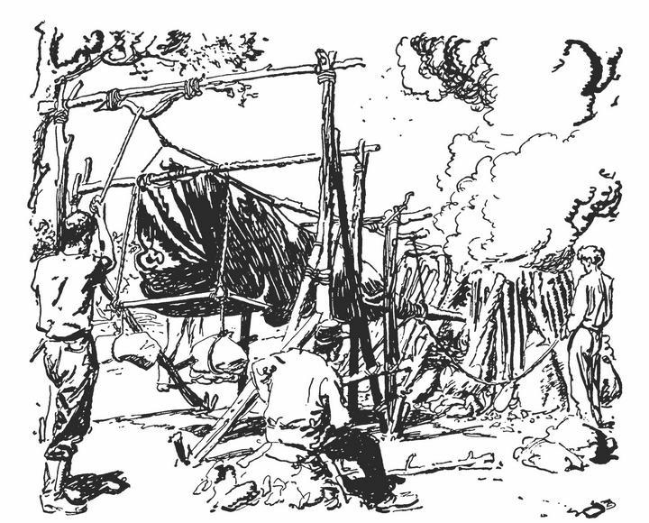 Колонисты тотчас же расположились лагерем. Менее чем через час у опушки леса, между деревьями, из ветвей, переплетенных лианами и покрытых глиной, наскоро устроен был шалаш, где можно было укрыться в случае непогоды. Перед ним развели сильный огонь, и после ужина, приготовленного на вертеле, в восемь часов все уже спали, за исключением одного, который должен был поддерживать огонь на случай появления опасного зверя.