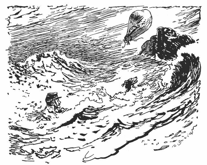 – Я знаю, что меня выкинуло из сетки шара и я погрузился в воду на несколько саженей глубины. Когда я вынырнул на поверхность, кругом было темно, и во мраке я почувствовал около себя какое-то живое существо. Это был Топ, явившийся мне на помощь. Я поднял глаза. Воздушный шар уже исчез. Я очутился среди разъяренных волн, на расстоянии полумили от берега. Я пытался бороться с бушующим морем и поплыл. Топ вцепился зубами в мою одежду и поддерживал меня на поверхности. Вдруг быстрое течение подхватило и понесло меня на север. Напрасно я боролся со стихией, я чувствовал, что иду ко дну и увлекаю за собой Топа… С этой минуты я ничего более не помню.