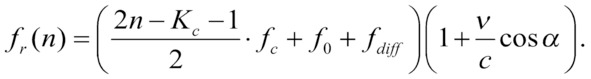 Текущая частота содержит сдвиг Доплера вследствие эффекта Доплера в канале связи (v и c – соответственно, скорости перемещающегося объекта и света, α – угол между векторами скорости) и разницу между эталонными частотами передатчика и приемника fdiff, f0 – несущая частота и fc – частотный разнос: