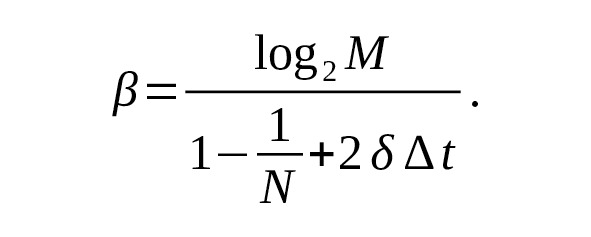 Оценка спектральной эффективности β может быть произведена следующим образом [70]. Теоретически спектральная эффективность может быть найдена как величина log2M, зависящая от порядка М-позиционной модуляции, где М – число точек в созвездии. Например, для BSPK это log22 = 1 бит/Гц, для QPSK – log24 = 2 бит/Гц. Если ∆t – время передачи одного OFDM-символа, то символьная скорость определяется величиной 1 / ∆t [символ/секунда]. Тогда битовая скорость определяется величиной log2M / ∆t. Полосу OFDM сигнала B удобно определить, зная число ненулевых поднесущих частот N, первую поднесущую частоту f0, последнюю fN-1 и половину ширины подканала в OFDM-системе, выражением B = fN-1 – f0 +2δ. Если поднесущие частоты в спектре распределены равномерно, получается равенство fN-1 – f0 = (N-1).∆f, где ∆f – частотный разнос между поднесущими частотами. При условии, что во временной области пренебрегается защитный интервал, и длительность OFDM-символа определяется только длиной БПФ, получается следующее: ∆f = 1 / (∆f.N), а Тогда спектральную эффективность для OFDM системы можно получить как величину: