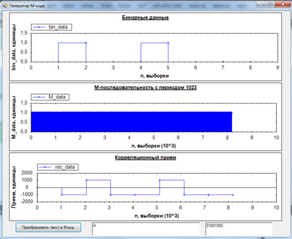 Рассмотрим сигнал, где несущая частота f0 = 5 ГГц, длительность одного чипа М-последовательности – TМ = 2/f0. На рис. 1.4 представлен прием сигналов с помощью корреляционного накопления, модель разработана на языке C#. Представлен простейший вариант, где сообщение заложено не в фазовые сдвиги м-последовательности, а в ее знак. Каждый бит представляется в виде сообщения длиной в 1023 бит (регистр сдвига 10 бит с обратными связями на 7 и 10 битах). Затем происходит накопление каждых 1023 бит результирующего сигнала, умноженного на опорную М-последовательность, и сигнал на выходе коррелятора показан на рис. 1.4 третьим сверху.