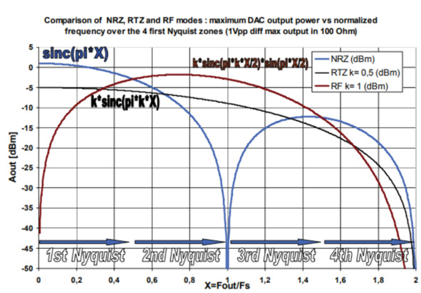 На рис. 1.5 представлена возможность работы ЦАП EV12DS130A (рисунок взят из даташита на соответствующую микросхему) на частотах выше частоты Найквиста. Режим NRZ позволяет преобразовывать сигнал из цифровой формы в аналоговую с полосой частот, лежащей в первой зоне Найквиста. С помощью режима RTZ можно сгенерировать сигнал, оставив низкочастотные гармоники, а режим RF нужен для переноса спектра на радиочастоту. Зависимость на рис. 1.5 представлена в виде функции Aout (X), где Аout – амплитуды сигнала в дБм, X = отношение частоты сигнала к частоте дискретизации. Полоса сигнала, которая будет передаваться в эфир, фильтруется далее с помощью аналового фильтра. В данном случае возможен « перенос» спектра сигнала на частоту до 6 ГГц без применения гетеродина.