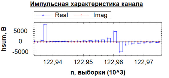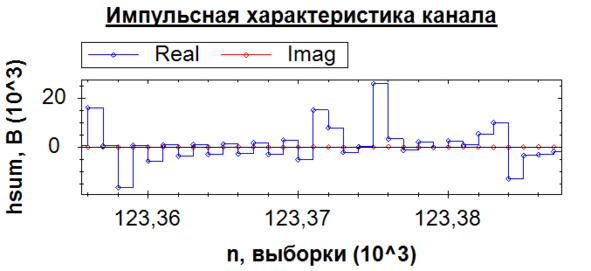 С помощью модернизированной программы А. В. Вагина [7], где расчет многолучевой картины ведется для множества поднесущих частот, построим передаточную функцию канала. Импульсная характеристика должна представлять сумму функций кронекера, находящихся на соответствующих временах задержки и обладающих соответствующими коэффициентами ослабления. На рис. 1.1 представлены увеличенные значения импульсной характеристики, на которых расположены функции Кронекера. За счет шага дискретизации функция немного размыта.