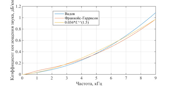 На рис. 1.2 рассчет проведен по 3-м известным формулам, описывающим зависимость затухания от частоты для гидроаккустических сигналов. Р. А. Вадов и Франкойс-Гаррисон занимались исследованиями затухания в гидроакустическом канале связи, и результаты их работ представляются в программном обеспечении Акустического института им. ак. Н. Н. Андреева. Для вычислений использованы следующие параметры [7]: