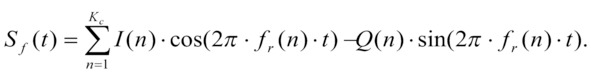 OFDM-сигнал на входе приемной части, прошедший через канал связи, без учета многолучевости и АБГШ может быть представлен с помощью следующей формулы с текущей частотой fr (n) с номером гармоники n, с числом гармоник Kc, данных I and Q (соответственно, синфазная и квадратурная составляющие), включающие в себя пилот-сигналы и нулевые составляющие: