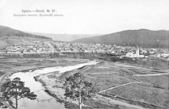 «Кусинский завод построен при слиянии реки Кусы с рекой Аем, протекающим здесь в узком живописном ущелье. Своим внешним видом Кусинский завод производит совершенно иное впечатление, чем Златоустовский. Мрачные старые строения, темные, тесные и потому грязные мастерские, где приготовляются снаряды и разные изделия из чугуна, свидетельствуют, что дела этого завода не блестящи и что он принадлежит к пасынкам. Можно сказать, что дела его были бы совсем плохи, если бы в последнее время не перешли на литье из чугуна различных художественных изделий, подобных приобретшим широкую известность изделиям Каслинского завода… Пришлось бороться с различного рода трудностями: не было ни сколько-нибудь подготовленных мастеров, ни помещений, ни нужных приспособлений. Но, по-видимому, дело это может наладиться: приготовляемый на заводе чугун обладает прекрасными для литья качествами, к тому же мало-помалу вырабатываются и мастера. Мне пришлось сравнивать изделия Кусинского завода с изделиями Каслинского, находящимися в продаже, и, по моему мнению, первые нисколько не уступают вторым. Конечно, изделия Кусинского завода не так разнообразны, но не надо забывать, что на Кусе это дело новое и обстановка для литья убогая. Собственно литейной мастерской нет, а к главному корпусу пристоен дощатый жалкий сарайчик. За чугуном бегают с ковшами по узкому проходу на довольно далекое расстояние. По вечерам работают с масленками, от которых больше темноты, чем света».