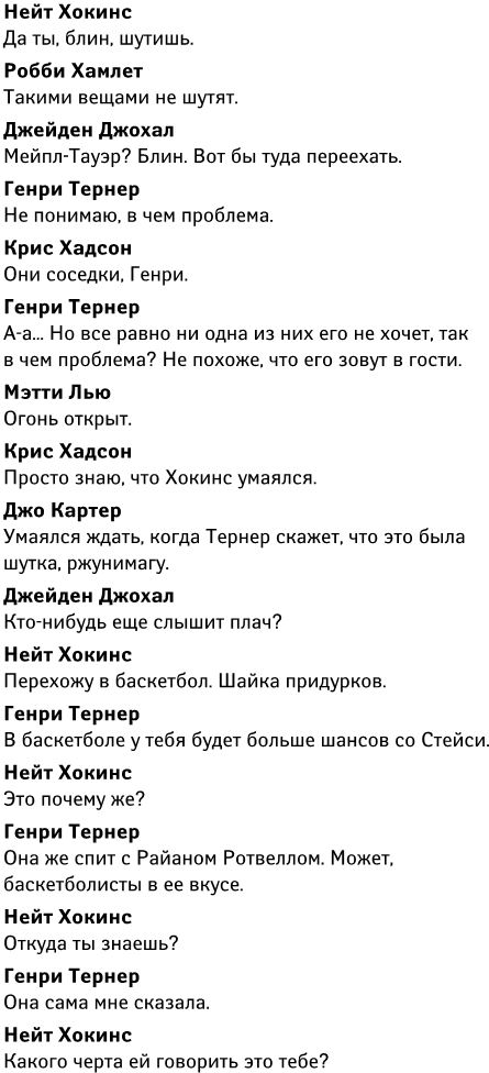 Предполагаю, что он хочет сообщить о существенном уменьшении доступных мне средств после расходов на вечеринку Робби, но все равно не хочу с ним разговаривать. Будь у меня нормальный отец, можно было еще подумать, что он хочет пожелать удачи, ведь завтра у нас первая игра сезона. Но, к сожалению, отец у меня не нормальный.
