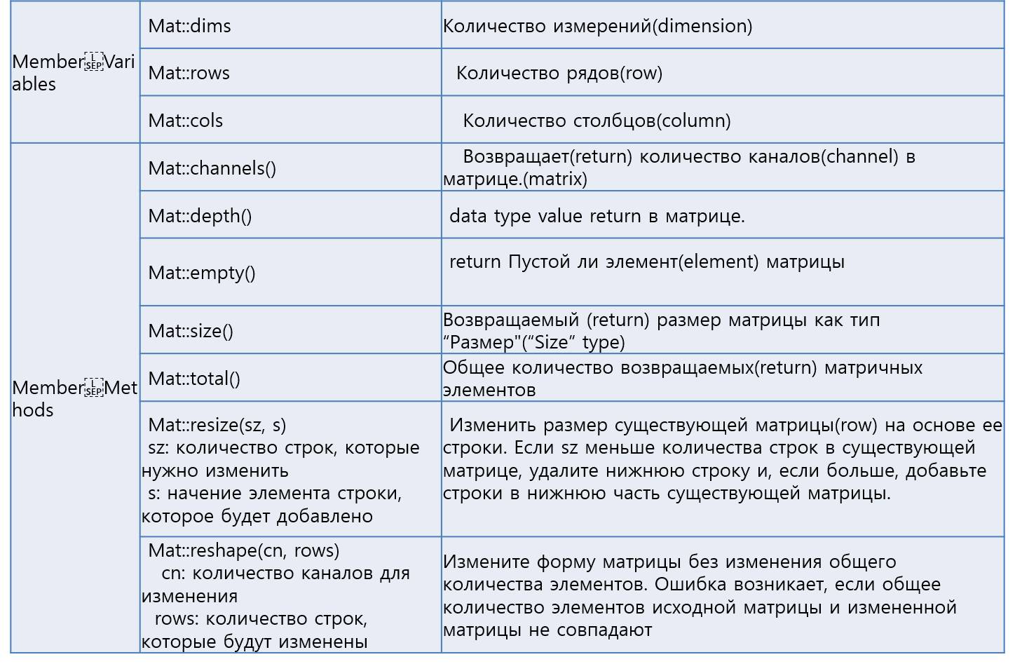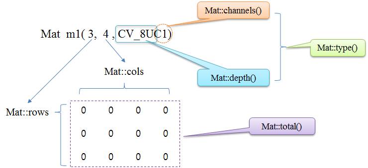 Mat (строки, столбцы, тип, скаляр (rows, cols, type, Scalar))
