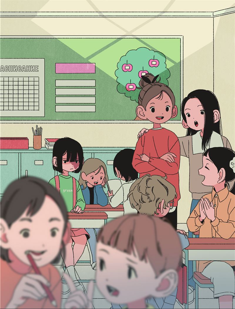 В этот момент в класс вошла Чина. Она увидела компанию Мичжон у своей парты.