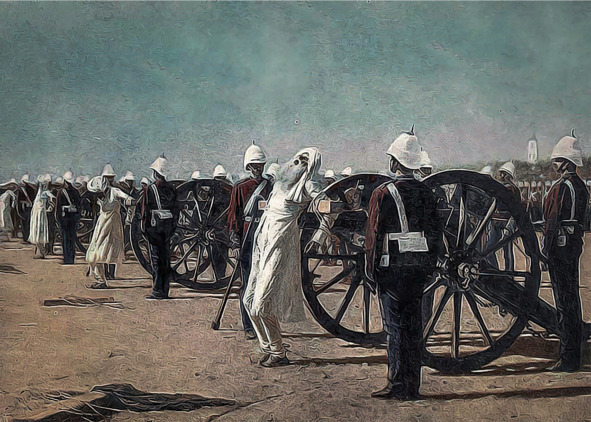 Дело в том, что некоторые офицеры из 51-го полка смогли в те дни бежать в сторону гор, что были недалеко. Их головы тут же оценили и доставили к ногам полковника и бригадира. Это стало решающим шагом. Именно Николсон со своей колонной пошёл против туземного полка, что шли к Дели, как вы помните, в начале бунта. Тогда в живых из всего полка, численность коего вам упоминал капитан Розенбаум, осталось только 120 человек, остальные были нагнаны и убиты там же. Когда этих пленных привезли в Пешавар на учебной площади было выстроено десять орудий, к которым и подвели абсолютно каждого без исключения.