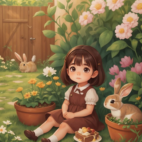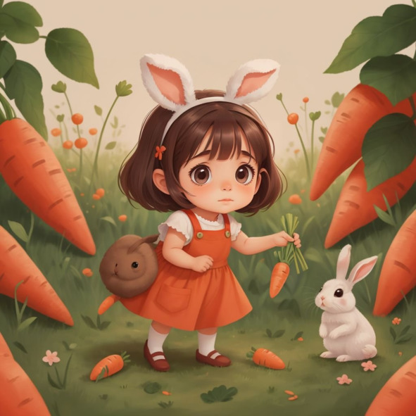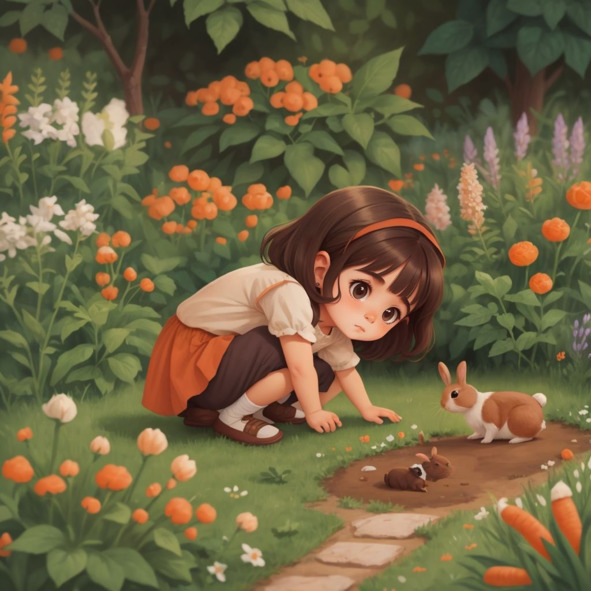 Emily loved to play in her garden. One sunny morning, she found a small rabbit nibbling on a carrot. Emily crouched down and watched quietly. The rabbit had soft fur and big, curious eyes. «Hello, little rabbit,» Emily whispered. The rabbit twitched its nose but didn’t run away. Emily decided to name her new friend Abigail.