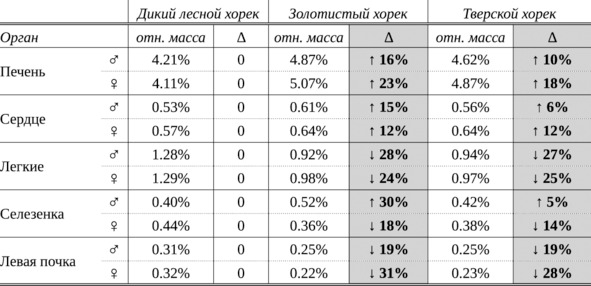 Таблица 2. Относительная масса внутренних органов диких хорьков и клеточных хорьков двух пород – золотистой и тверской (по данным: Федорова, Тюрина, 2011). Обозначения: отн. масса – относительная масса органа в % от массы тела; Δ – отклонение от пропорционального изменения.