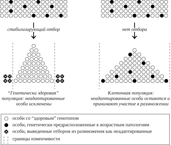 В природе такие нарушения элиминируются естественным отбором (точнее, особой его формой – стабилизирующим отбором), и вероятность их передачи по наследству оказывается незначительной. При разведении в неволе подобные нарушения также можно исключать путем стабилизирующего искусственного отбора, для этого необходимо не допускать к размножению тех животных, у которых с определенного возраста выявляются врожденные проблемы со здоровьем. В противном случае в популяции будут оставаться и накапливаться «неадаптивные» гены (рис. 5).