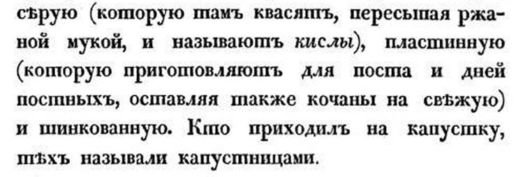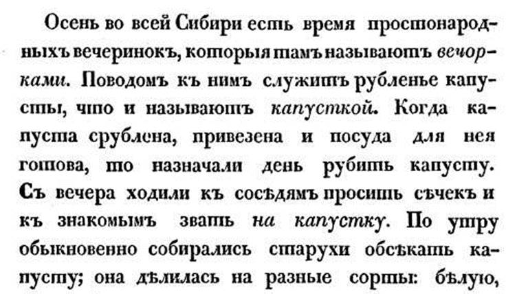 «Капустник – не что иное, как капустная рубка, совершаемая ежегодно с особенным весельем. Как приходит осень и наступает время капустной рубки, уже начинают заботиться о капустниках. Каждые знакомые или родные между собой уговариваются, у кого, когда быть капустнику, чтобы сделать в разные дни и повеселиться на том и другом.